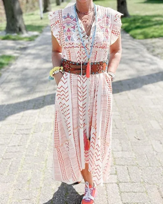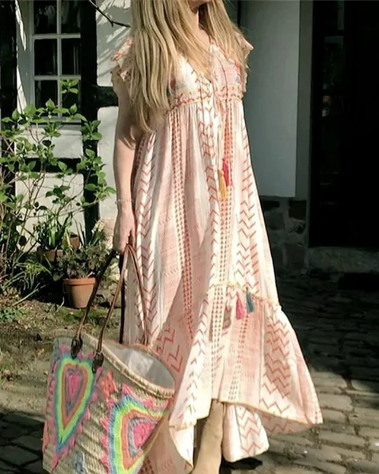 Printed V Neck Ruffle Hem Sleeveless Tassel Design Casual Loose Midi Dress